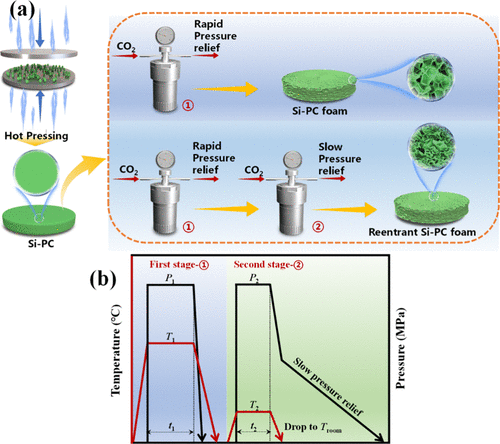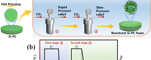 (a)Si-PC泡沫和凹角Si-PC泡沫的制备流程示意图。(b)双级超临界CO₂发泡过程中温度和压力的实验控制。