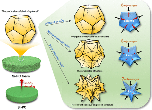双阶超临界CO₂发泡技术的核心创新在于利用细胞内外的压力差与表面张力的协同效应。四川大学生物材料工程研究中心的研究表明,该技术能够实现从具有刚性分子链的工程塑料聚合物直接转化为闭孔重入式凹角泡沫( closed-cell reentrant concave angle structure),这一过程的关键在于对发泡过程中热力学和动力学条件的精确控制。