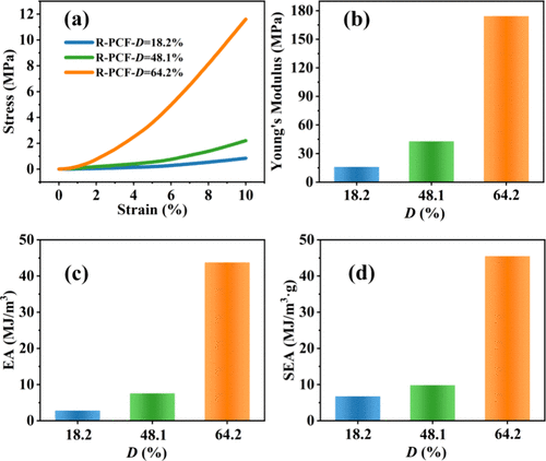 (a)不同D值的R-PCF样品的压缩应力-应变曲线。(b)杨氏模量,(c)能量吸收,以及(d)不同D值的R-PCF样品的比能量吸收(D值:PCF的微观结构形态转变为凹角结构的程度);D=64.2%的R-PCF表现出优异的能量吸收能力,其能量耗散高达43.8 MJ/m³,这使其在防护装备材料领域更具竞争力。