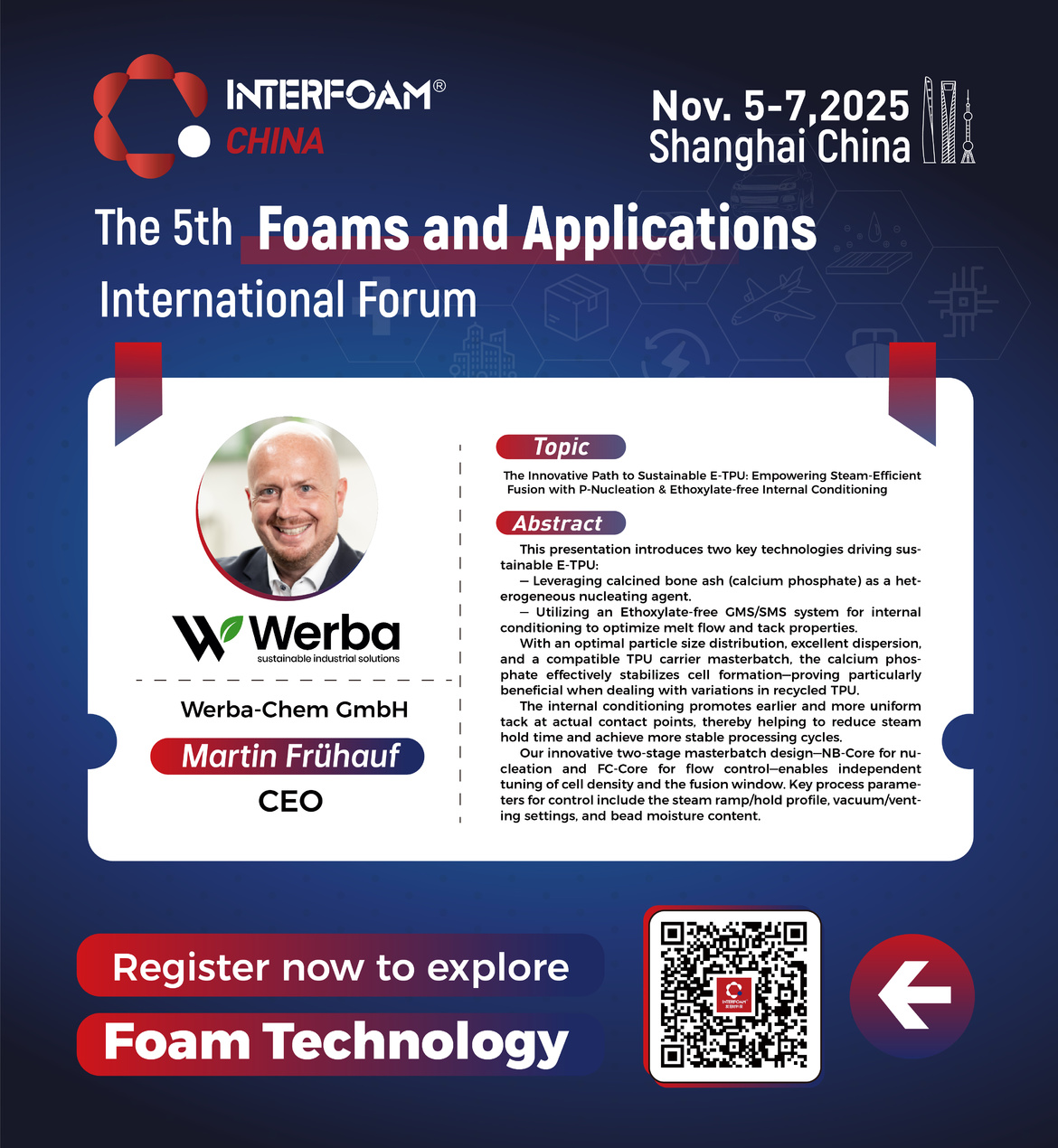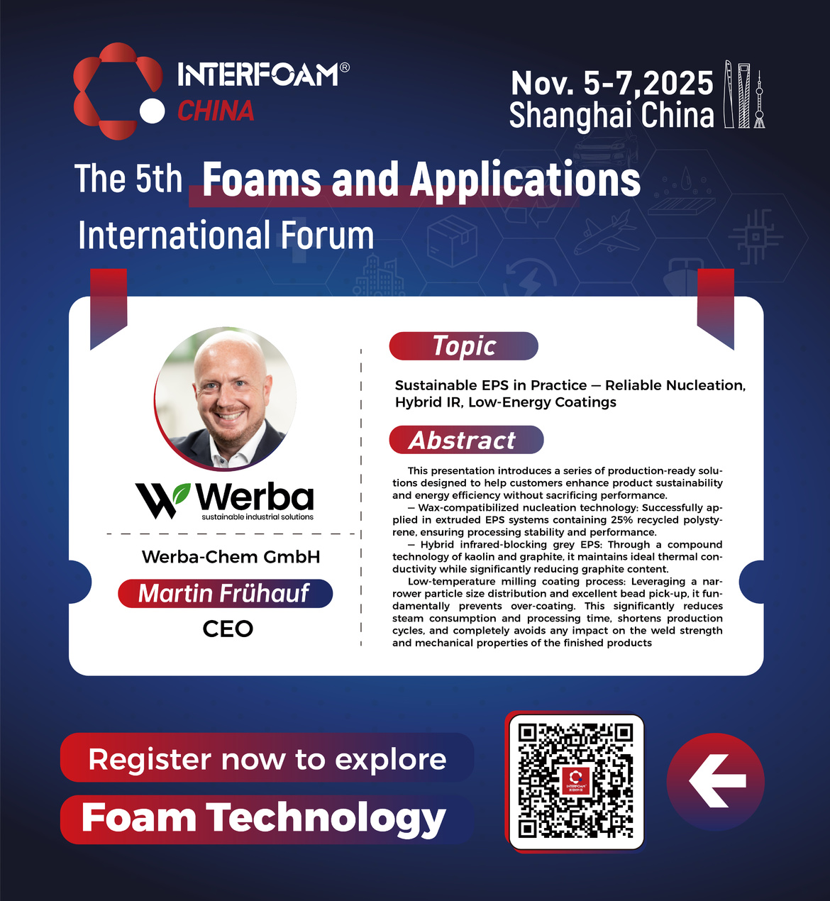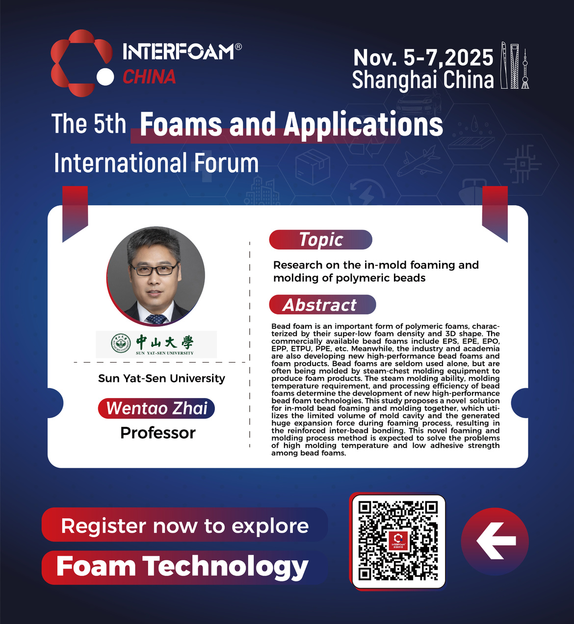 The 5th International Foams and Applications International Forum, with the theme of “New Dimension Foam Boundless Applications”, will open in the Conference Area of Hall E5, Shanghai New International Expo Center from November 5 to 7, 2025. Pre-register now to access high-quality knowledge about foam technology!